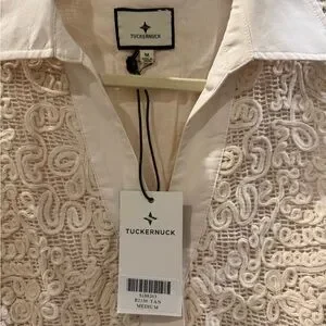 Chic lace top with intricate patterns. Features a classic collar. Ideal for stylish outings. NWT. Size medium.