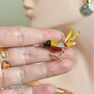 Charming bird brooch with sparkling crystals. Features vibrant red, green, and yellow hues. Perfect for adding flair.