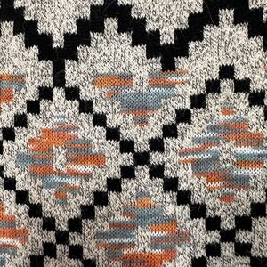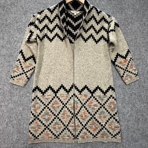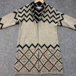 The Linda Anderson Long Cardigan in size S is a stylish and versatile piece perfect for casual occasions during the fall, winter, and spring seasons. This Southwest styled, mid-thigh length, shawl-type cardigan in Desert Horizon Beige features a geometric pattern in a medium-knit fabric made of polyester and acrylic. Easy to care for with machine washable instructions, this cardigan from the brand Linda Anderson is a must-have addition to any woman's wardrobe. The long sleeves and cardigan style provide both comfort and style for everyday wear.