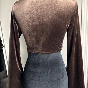 This elegant velvet top features a stylish tie-front design, perfect for any occasion. The rich brown color adds a touch of sophistication to your wardrobe.