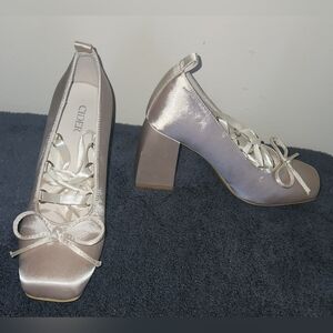 Elegant cream satin heels by Cider, perfect for any occasion. Features a stylish bow and lace-up design for a chic look.