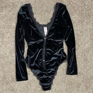 Chic black velvet bodysuit with lace accents. Features a plunging neckline and button details. Ideal for evening wear.