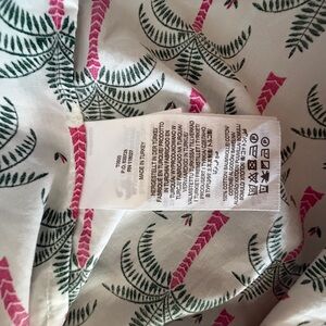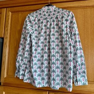 100% cotton, lovely and crisp. Smocked neckline with a palm tree print. Measures 21” pit to pit.