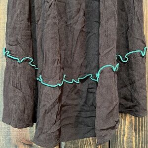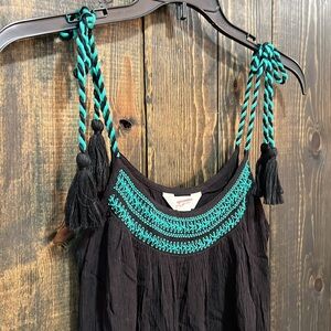 Arizona Jeans brand bohemian rope tank top. Size small. Black with teal green accents. Sleeveless. Embroidery design on neckline. Ruffles. Rope tie straps with tassel details. Y2K Vibes. Stretch material. Relaxed / Flowy fit. Preloved. Please see all photos for condition.