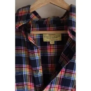 Classic Kenyon Ridge plaid button-down flannel shirt in a multicolor pattern featuring navy blue, red, green, and yellow tones. Soft 100% cotton fabric with a relaxed everyday fit — perfect for layering or casual wear.