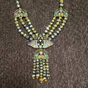 Intricate design in a green and blue colour palate with old gold findings. Features elegant tassel detail, iridescent faceted crystals, and pave work. Perfect for any occasion. Add the wow factor to your little black dress. Or add sparkle to your everyday. Suggestion: worn with a classic button-up with the collar open and your favorite jeans.
