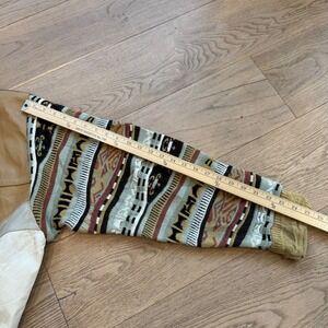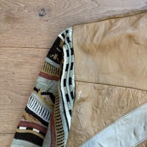 Vintage mixed-media pullover sweater from the Saxony Collection features a bold geometric patchwork of genuine leather panels across the front and upper back. The sleeves and lower back showcase a vibrant Coogi-style 3D textured knit with intricate patterns in earthy tones. Designed with a ribbed crew neck, cuffs, and hem, this piece offers a unique 90s aesthetic. Note some minor scuffing and small white marks on the leather panels as shown in photos.