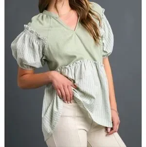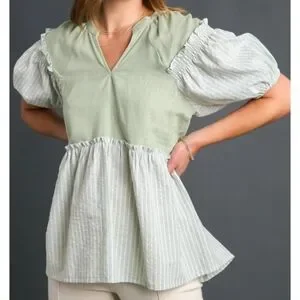 This elegant sage green blouse by Umgee features charming puff sleeves and a relaxed peplum silhouette. The ruffled details add a touch of femininity, making it a versatile piece for both casual and dressy occasions.