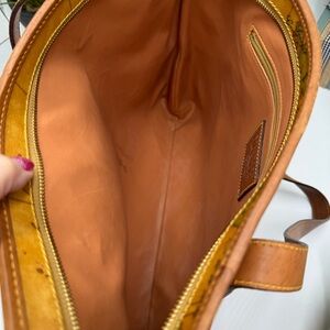 * Interior: Spacious main compartment with a smooth tan lining and one interior zip pocket for essentials.