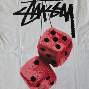 Clean white Stüssy tee featuring classic logo on front and bold red dice graphic on the back. Iconic streetwear piece that stands out but still easy to style.