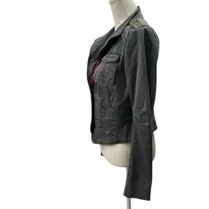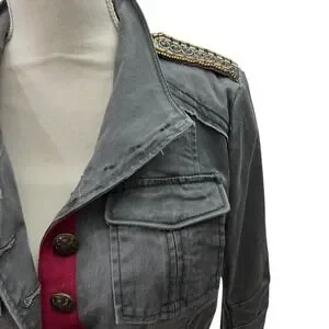 This stunning military-inspired band jacket brings a bold, tailored silhouette with real attitude. Charcoal gray cotton twill with an eye-catching contrast red interior placket, ornate brass buttons, and shoulder epaulettes. The cropped cut and sculpted waist give it an elevated, feminine shape that pairs effortlessly with denim, leather pants, or dresses. Think downtown-chic, Parisian street style, and rockstar glam.