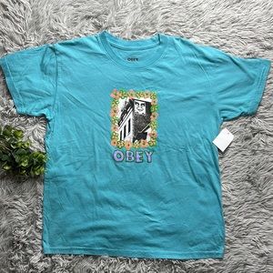 NWT obey teal Flower Frame Organic Cotton Graphic T-Shirt size s