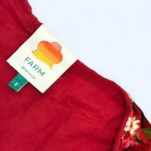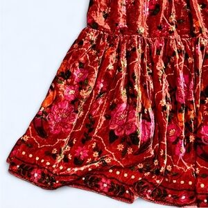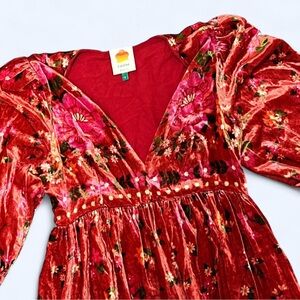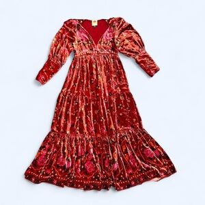 Farm Rio - Romantic Garden Velvet Floral Long Sleeve Dress features a deep V-neckline, long bishop sleeves, and a tiered maxi silhouette in a romantic red floral print with beaded button detail