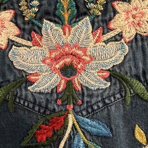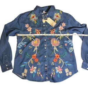 JOHNNY WAS Embroidered Western Denim Shirt Floral Blue Birds Pearl Snap S