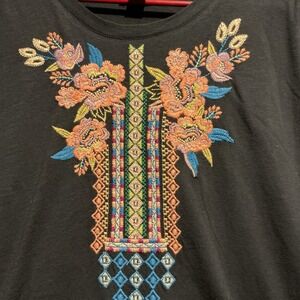 Embroidery is pristine! Excellent preowned condition. Black is still very black. No obvious fading. Hems are good, no loose stitching. No stretch marks. It's. To out of shape. Very well cared for. Pit to pit is 201/2". It could possibly be a very dark blue. It's just dark.