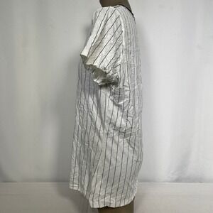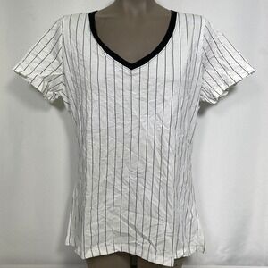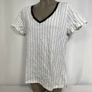 Soft cotton t-shirt features a classic baseball-inspired pinstripe pattern in white and black. Designed with a flattering V-neckline accented by a solid black trim, this short-sleeve top offers a sporty yet casual look perfect for game days or everyday wear. The lightweight jersey fabric ensures breathable comfort, while the relaxed fit provides a versatile silhouette.