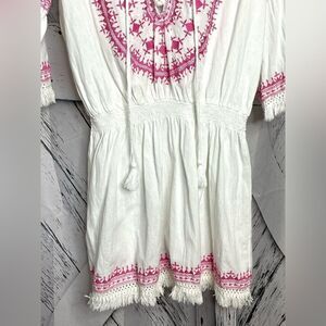 Chic mini dress by Melissa Odabash. Features white fabric with pink embroidery. Lace-up neckline. Perfect for summer.