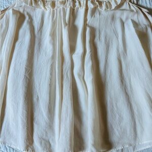 Elegant cream top with ruffle details. Sleeveless design. Yoke design. Flowy fit. Perfect for interviews or business casual attire.