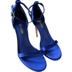 New in the box and never worn, these pretty royal blue heels feature a bow that can be easily attached to the back strap or the toe strap (or not at all).