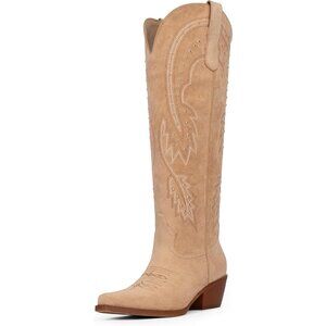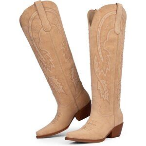 Women's Tan Knee High Rhinestone Cowgirl Boots Pointed Toe Slip on Chunky Heel