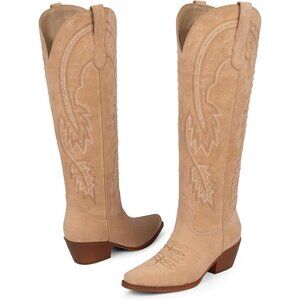 Distinctive Western Design: Tall cowboy boots with intricate Western embroidery + stud accents—blends rustic charm & trendy flair; eye-catching details for a standout look.