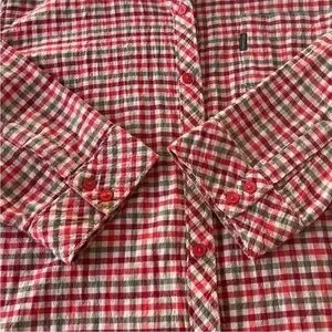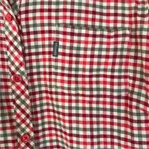 Columbia button-down shirt in a red, green, and white plaid print with lightweight crinkle-textured cotton. Easy, breathable piece that works for casual wear, travel, or layering. Classic outdoor-inspired style with a relaxed everyday fit.