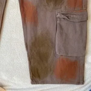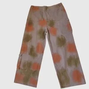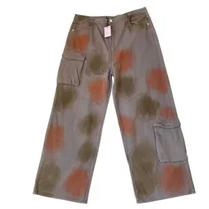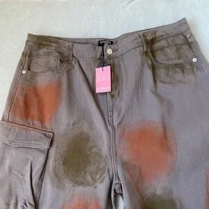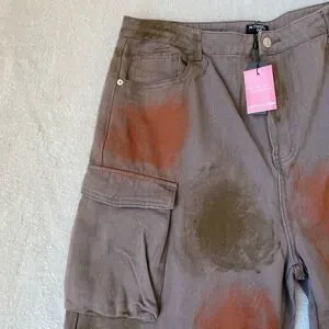 NWT Pretty Little Thing Wide Leg Cargo Pants in brown color with rust orange & olive paint-style spots