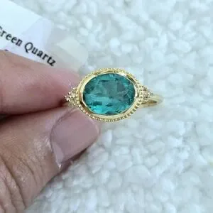 Ellipsed (sideway oval) green💚 quartz with a cluster of three3️⃣ dainty white topaz on either side set on a thin gold💛 band