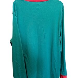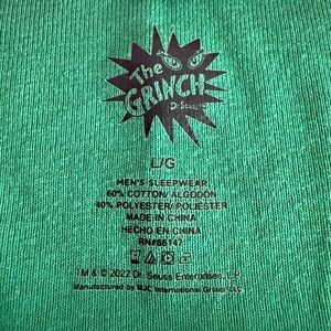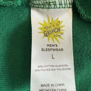 Celebrate the holiday season with this playful Dr. Seuss long sleeve tee, featuring a vibrant green body and contrasting red accents. The front showcases a large graphic of the Grinch in a Santa hat, adding a touch of festive humor. Made from soft material, this top is perfect for casual holiday gatherings or sleepwear. Red trim crewneck and red cuffs. From 2022 Holiday Season. Worn once for Holiday photos. Screen print is in excellent shape. Size: Large 60% cotton 40% polyester. Measurements laying flat: