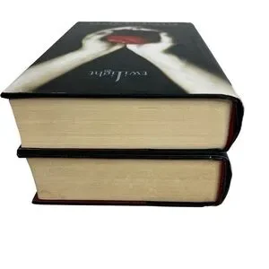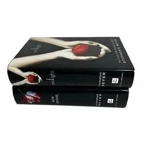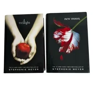 Set of two hardcover books: Twilight and New Moon by Stephenie Meyer. Iconic covers with black, red, and white design.