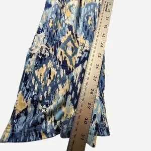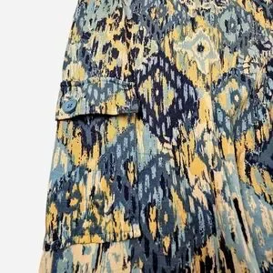 These wide leg cargo pants are seriously comfy and flowy! Perfect for the beach or lounging. Attractive abstract blue, white, and yellow design.