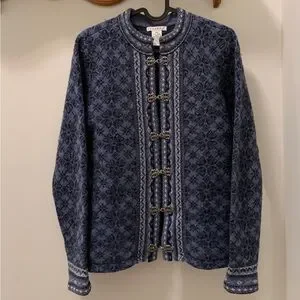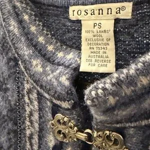 Elegant gray wool cardigan. Features a decorative clasp. Made by Rosanna.