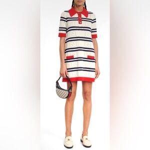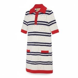 Chic Gucci dress with white and navy stripes. Red accents on collar and sleeves. Perfect for casual wear.