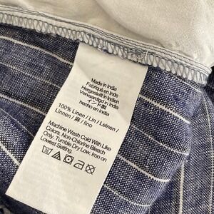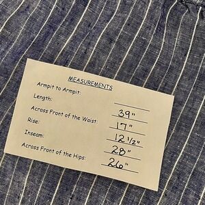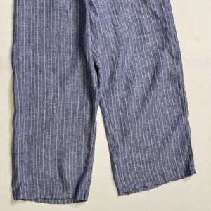 Elastic/Stretchy waistline … inset drawstring tie in the waist that ties on the front ~ Two inset/side pockets … two patch pockets on the backside ~ Wide full length legs ~ Pullover styling ~ Soft unlined non-stretch 100% woven linen fabric ~ Chambray blue with white vertical stripes