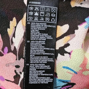 Forever 21 Contemporary floral blouse in women’s size Large. Black base with a vibrant multicolor floral print, sheer-feel woven fabric, and vertical black lace trim down the front and back. Button front, 3/4 sleeves with tab-button detail, and an easy relaxed fit. Perfect with jeans or shorts for spring and summer.