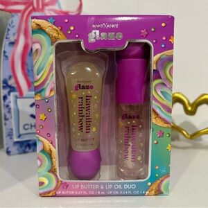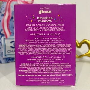 Indulge in the Glaze Hawaiian Rainbow Lip Butter & Oil Duo. This set features a nourishing lip butter and a hydrating lip oil, both in a vibrant purple hue. Perfect for keeping your lips soft and moisturized.