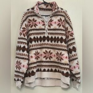 Ultra-soft Aerie sherpa pullover! Featuring a beautiful Fair Isle inspired pattern with brown snowflakes and pink accents on a cream background. The quarter-zip design and elastic cuffs make it perfect for layering during chilly weather.