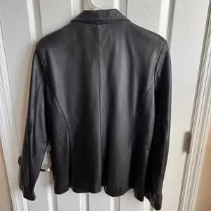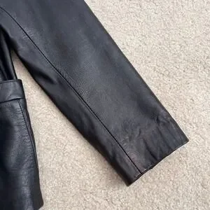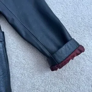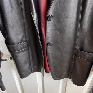Classic leather blazer that will add a touch of sophistication to any outfit. This jacket features a single-breasted button closure, notched lapels, and two front pockets. The black exterior gives it a sleek and timeless look, while the unique red lining adds a pop of color and personality. The jacket is fully lined for comfort and durability and has a tailored fit that flatters the figure. Pre-owned condition, see all photos for wear and approximate measurements. Smoke and pet free home.