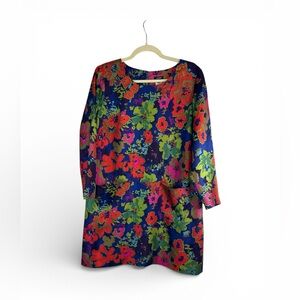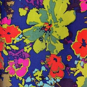 Stunning J.Crew 100% silk floral dress featuring a bold, retro-inspired print in vibrant cobalt blue with pops of hot pink, red, lime green, and purple. This eye-catching piece has major vintage mod, whimsy, and statement vibes — perfect for anyone who loves standout color and playful prints.