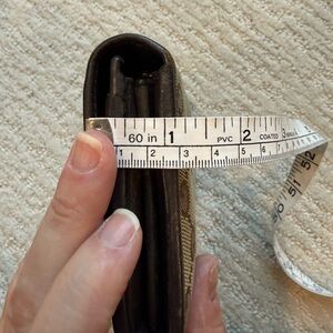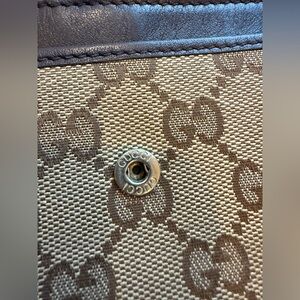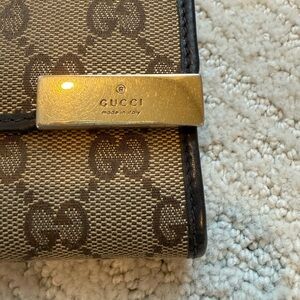Gucci GG logo brown wallet. Fabric with leather trim and interior. Outside has some minor marks and wear. Small corner rubs. There is some color loss to the gold Gucci plate on the corner. Inside is clean. Interior is leather. Card slots are tight and not stretched. Coin compartment is clean. Snap closure is functional and without issues.