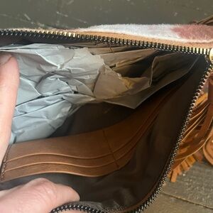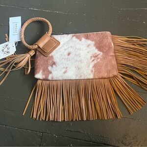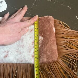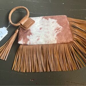 Stylish Brown and White Cow Print Fringe Vegan Handbag