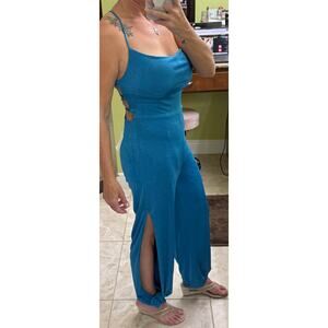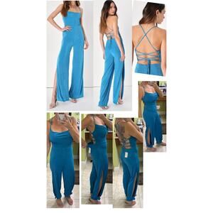 Lulus Medium Owning the Vibe lace-up split-leg blue dressy jumpsuit ($65 retail) long side slit. This brand new, with tags piece is absolutely perfect for your next special occasion or a chic night out. open back lace tie closures tall girl friendly summer resort vacation sexy romantic