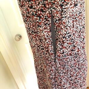 Beautiful casual dress, red orange ditsy floral print, smocked skirt & cuffs, puff sleeves, side zip