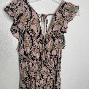 Xhilaration maxi dress features a vibrant pink and tan floral paisley print over a black background. Designed with a flattering faux-wrap V-neckline and delicate ruffle cap sleeves, this piece includes a stylish tie-back detail and a comfortable elasticized waist. The lightweight fabric and flowy silhouette make it an ideal choice for boho-inspired summer outings or casual events.