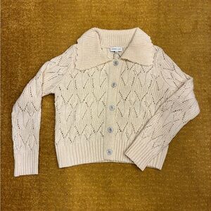 Chic cream cardigan with intricate knit design. Features a classic collar and button-up front. Ideal for layering.