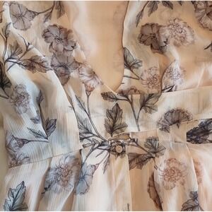 ASTR The Label midi dress features a delicate floral print on a light blush pink chiffon fabric. This romantic piece is designed with a deep V-neckline, short flutter sleeves with cold-shoulder slit details, and a flattering empire waist that leads into a flowy skirt. The back includes a self-tie sash for an adjustable fit, and the front is accented with a single decorative button at the waist. Fully lined for comfort and coverage, this dress is perfect for weddings, garden parties, or brunch.