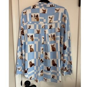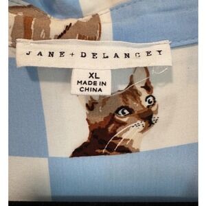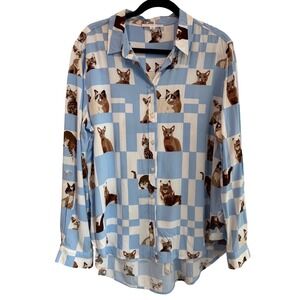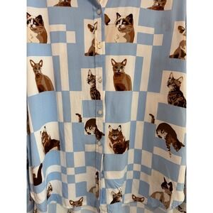 Jane + Delancey Women XL Blue White Checkered Cat Print Rayon Button Down Shirt