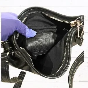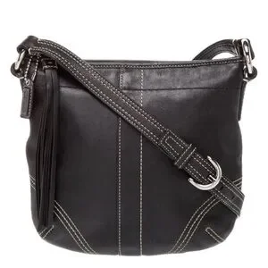 Vintage Y2K Coach crossbody Soho mini bag in sleek, durable black leather, with designer detail stitching. Strap has buckle for adjustment. Bag has zippered closure, silver toned hardware and tassel detail. Perfect size for carrying the essentials. Excellent condition.