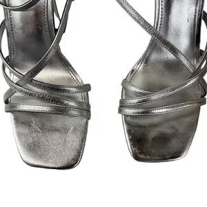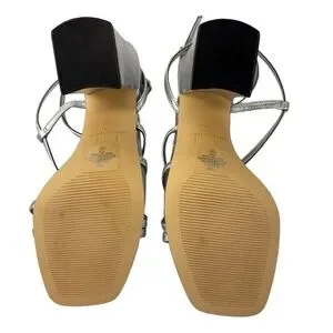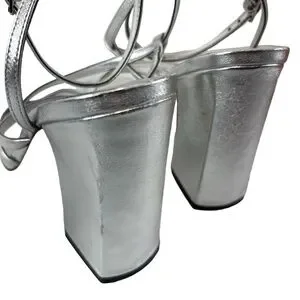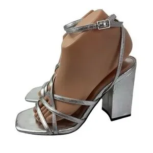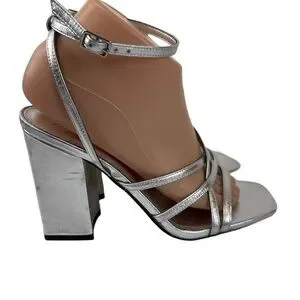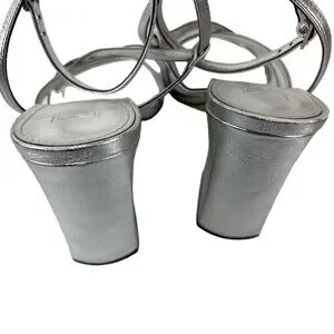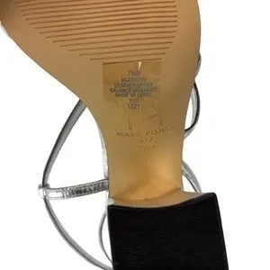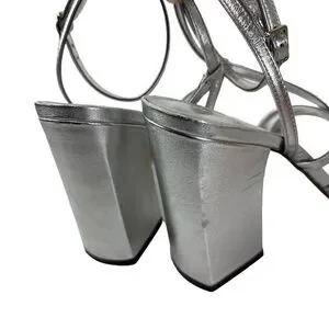 Keywords: marc fisher, edalyn, womens 7.5m, silver sandals, strappy heels, block heel, 4 inch, buckle closure, special occasion, prom, wedding, party, formal, elegant