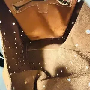 Features: Open-top carryall with two top handles; interior zip pocket; unlined raw leather/suede interior